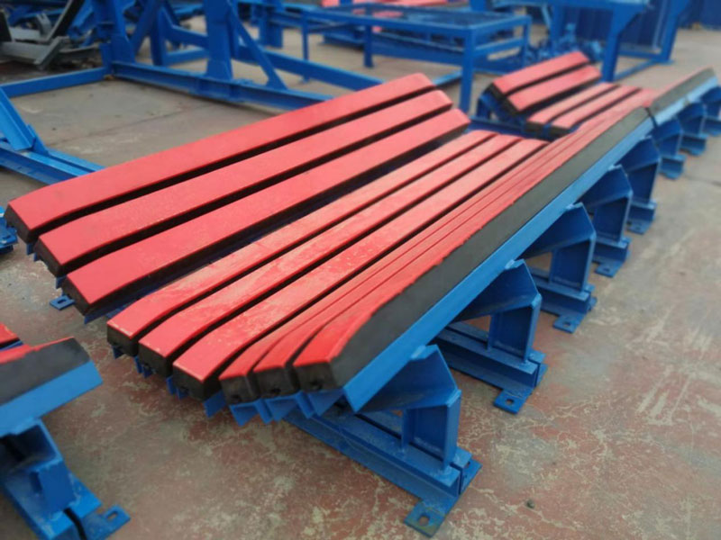 緩沖床主要用于替代緩沖托輥,緩沖床由緩沖條組成,而緩沖條主要應(yīng)用優(yōu)良的高彈性特種橡膠層充分有效吸收了物料下落時(shí)的沖擊力,大大降低了物料下落時(shí)對(duì)輸送帶的沖擊,真正的改善了落料點(diǎn)的受力狀況。并采用特殊的UHMW高分子聚乙烯表面,使輸送帶與緩沖條之間的摩擦系數(shù)降到最低,且耐磨性好。緩沖床的使用保證了輸送帶的面與面的接觸,受力均勻,有效防止了由于托輥斷裂、脫落造成的皮帶縱向撕裂,同時(shí)大大降低了皮帶被銳器或尖銳物料穿透后縱向撕裂的概率。